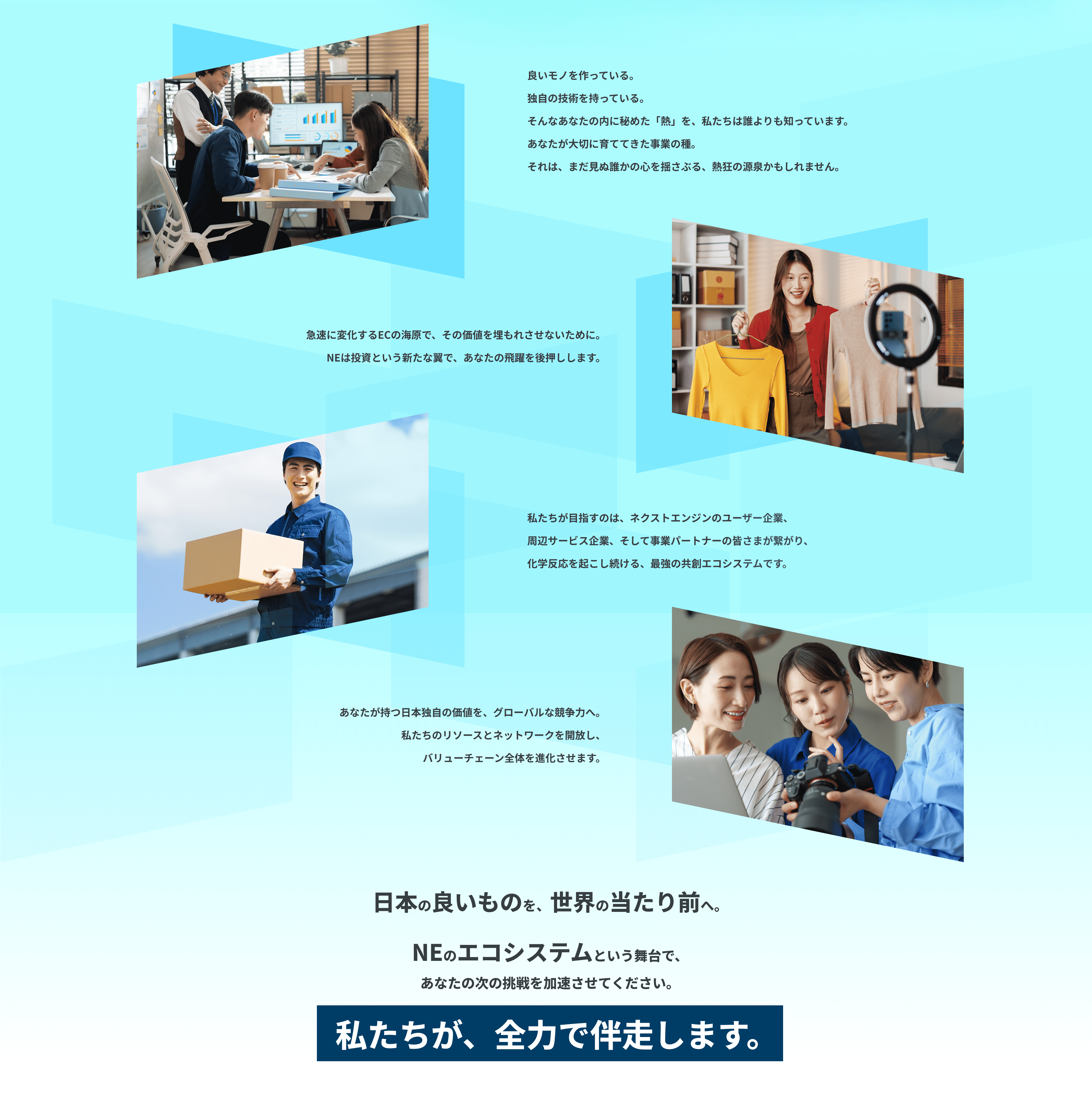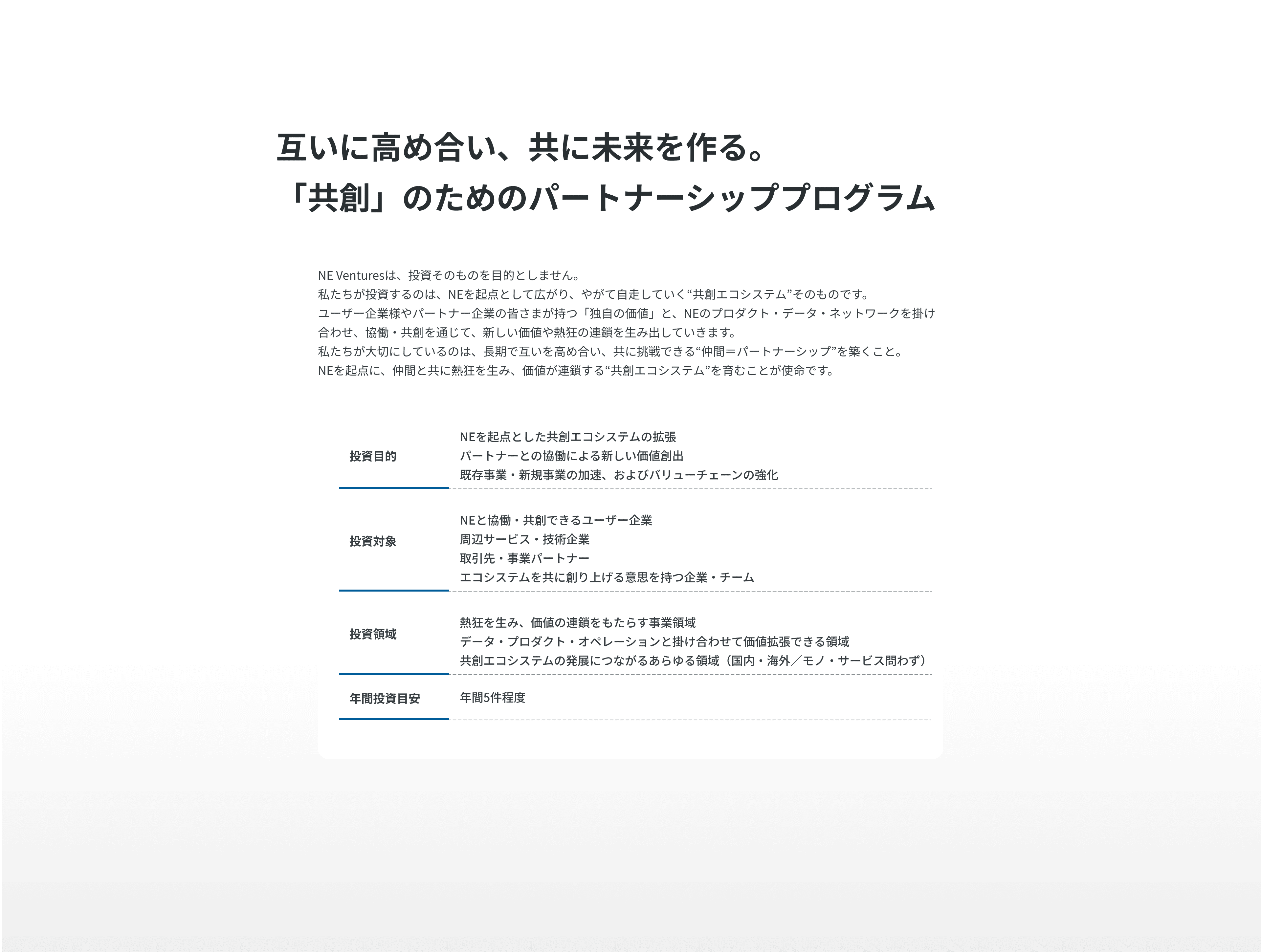 私たちは、ネクストエンジンを取り巻くエコシステムの中で、既に独自の価値を確立されている企業の皆様と共に、次のステージを目指したいと考えています。単なるアイデアではなく、現在の事業をベースにした具体的な連携や、当社のCVCを活用した成長戦略について、まずは膝を突き合わせてお話ししましょう。あなたの事業の「次の一手」をお聞かせください。